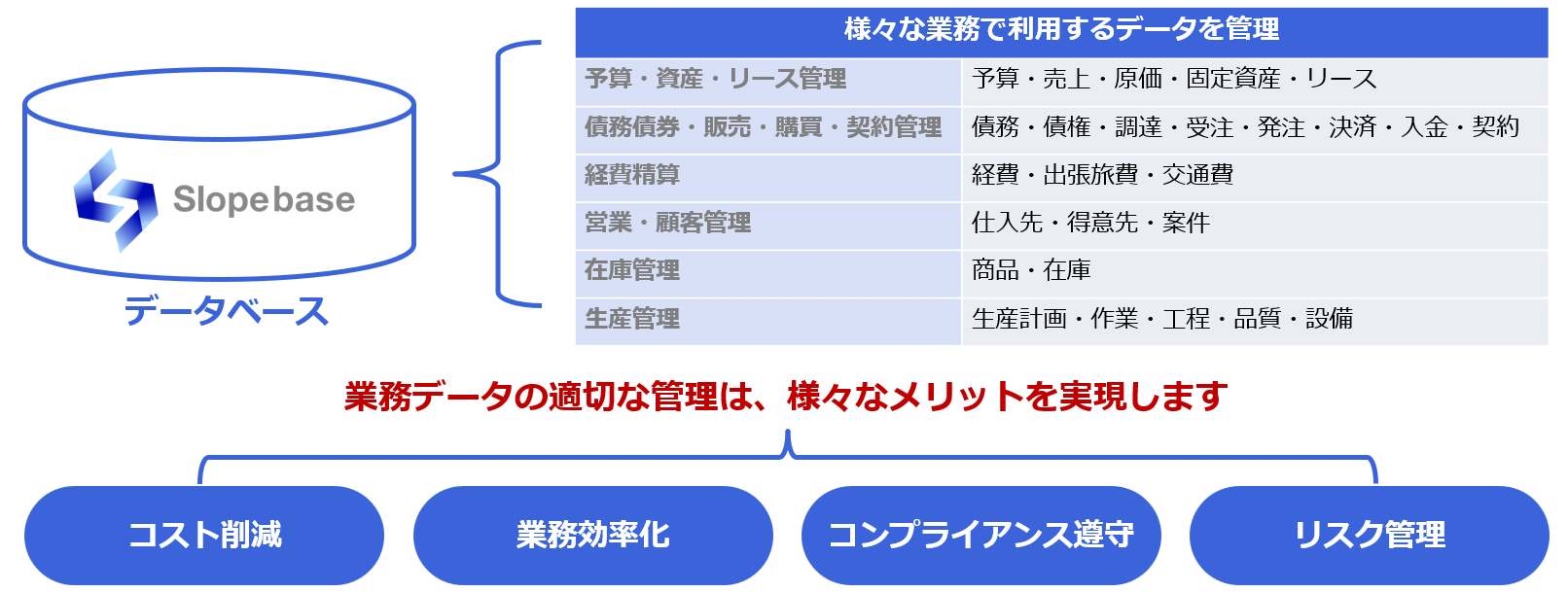 社内の業務データをクラウド上のWebデータベースに統合管理し、業務効率を最大化します。こうした業務データの適切な管理は、「コスト削減」「業務効率化」「コンプライアンス遵守」「リスク管理」など、様々なメリットを実現します。